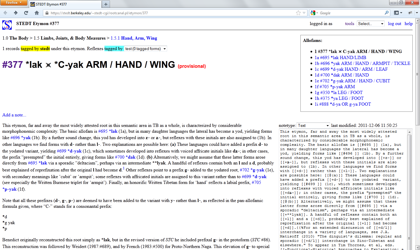 An etymon may have a number of allofams (variant forms). When one clicks on a tag number in the lexicon table or etyma table, a page appears giving an overview of the reflexes tagged for that etymon. If the etymon has a number of allofams, these are listed in the allofam box in the upper right-hand corner of the webpage: