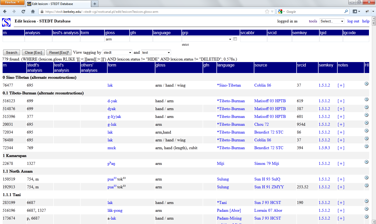The lexicon table is used to search all of the lexical entries in the database: reconstructed proto-forms from various publications; lexical data from Tibeto-Burman languages; Chinese comparanda; and select forms from languages which have contributed loanwords into Tibeto-Burman languages (Nepali, Old Mon, Proto-Hmong-Mien, Thai, etc.).