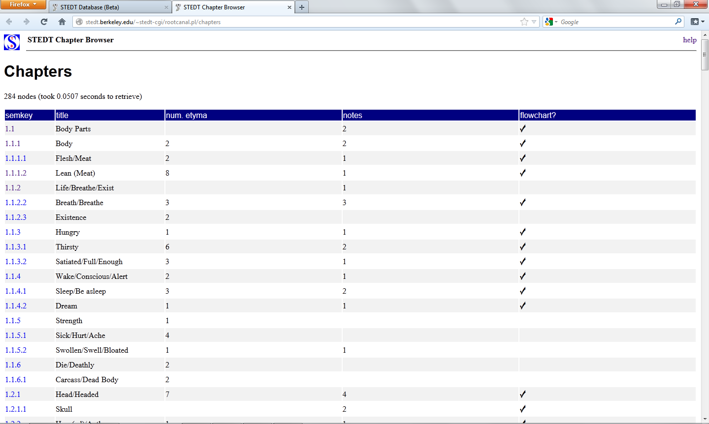 Title indicates the semantic category or subcategory associated with each semkey. Num. etyma gives the number of reconstructed etyma for a semkey. The notes column indicates whether there are etymological notes available for the semkey. If there are etymological notes available, a number indicates how many are available. To view the etymological notes, click on the semkey number at the far left of the page. The flowchart column indicates whether a semantic flowchart is available for the semkey, with a checkmark indicating that a semantic flowchart is available. To view the semantic flowchart, click on the semkey number at the far left of the page.