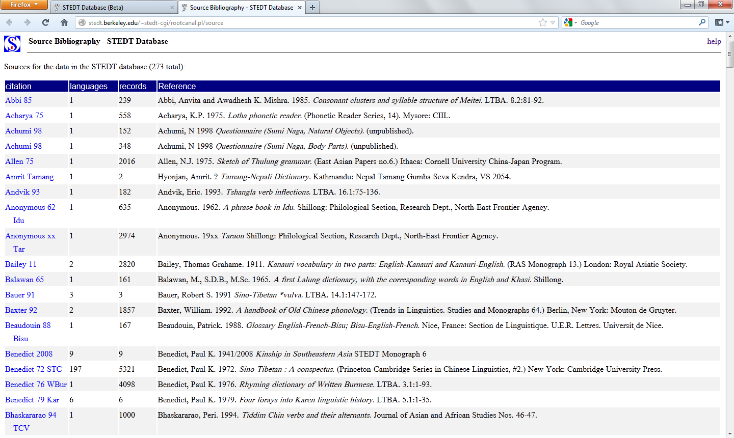 The Source Bibliography provides bibliographical references for all of the source data contained in the STEDT database. Information is arranged in four columns: